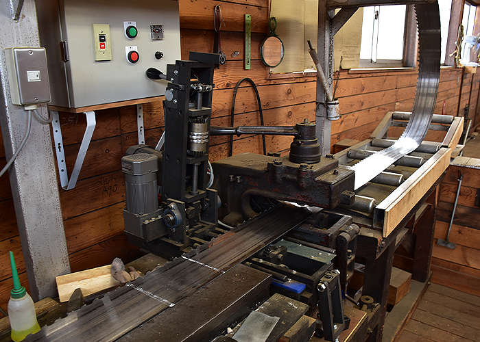 飯島製材所では、帯鋸目立て機を導入(ソーテック㈱製)を導入し、専用のこぎりを職人が毎日目立てしております。大割作業において、自社で帯鋸の目立て加工を施し、製材する木材に合わせて鋸を作り上げる必要があります。弊社では、湿式の目立て機を採用して、毎日のこぎりの手入れをすることで、製品の精度を保っております。